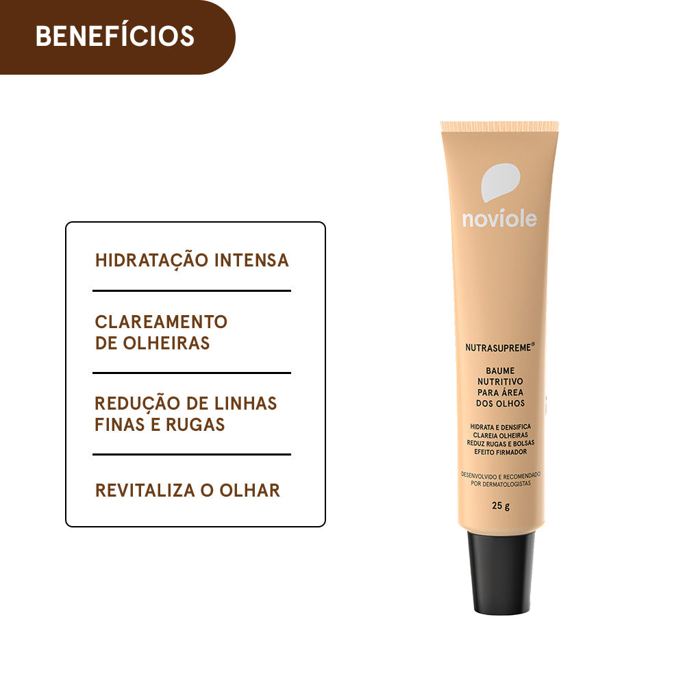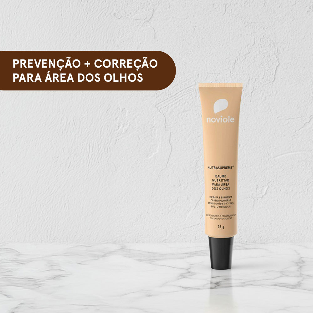 Mais fina e sensível do que no resto do rosto, a pele da região dos olhos requer cuidados especiais, e foi pensando nesses cuidados que desenvolvemos o Baume Nutritivo para Área dos Olhos NutraSupreme®, um tratamento multifuncional com múltipla eficácia comprovada. Sua fórmula inovadora desenvolvida por dermatologista, fruto de 30 anos de expertise e pesquisas, hidrata intensamente e densifica as pálpebras, clareia olheiras e edemas nas pálpebras, melhora a microcirculação, previne e reduz rugas e linhas de expressão com estímulo intenso de colágeno, ácido hialurônico e elastina aliado aos potentes efeitos antioxidante, promovendo lifting e revitalização da região.