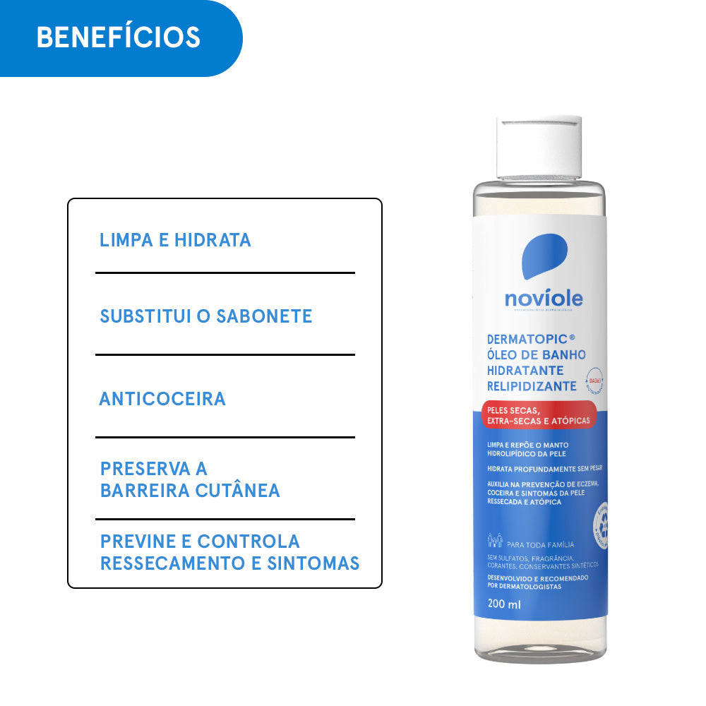 O Óleo de Banho Hidratante Relipizante Dermatopic® é indicado para peles secas, extra-secas e sensibilizadas/atópicas. Syndet (sem sabão), limpa e hidrata a pele, preserva a barreira cutânea e substitui o sabonete tradicional. Auxilia na prevenção e controle da coceira pós-banho, irritações e demais sintomas de ressecamento.