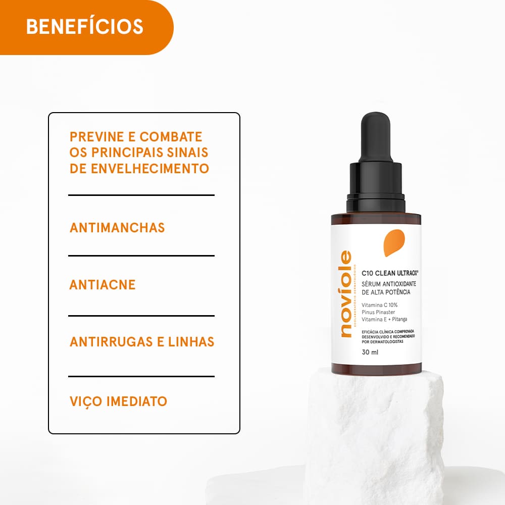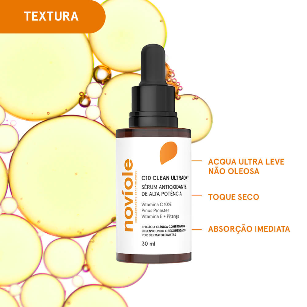 O C10 Clean ULTRAOX® é uma solução inovadora de prevenção e correção de sinais de envelhecimento da Noviole, com fórmula inovadora e exclusiva para prevenir e corrigir manchas, linhas de expressão e acne com sua ação altamente anti-inflamatória e antiacne. Em textura acqua inconfundível, com absorção imediata e acabamento confortável até nas peles mais oleosas, elimina os radicais livres das células, prevenindo e reparando o estresse oxidativa da pele e melhorando visivelmente a qualidade da pele com viço e radiância. A tecnologia antioxidante exclusiva ULTRAOX®, fruto de 30 anos de expertise dermatológica e pesquisas, traz um blend botânico inédito composto por Pinus Pinaster, Vitamina C, Vitamina E e Extrato de Pitanga. Seu principal ativo possui ação antioxidante 50x mais potente que a Vitamina E e 20x mais potente que a Vitamina C, além de reciclar e prolongar os efeitos destas vitaminas e agir na pele por até 72h pós aplicação.